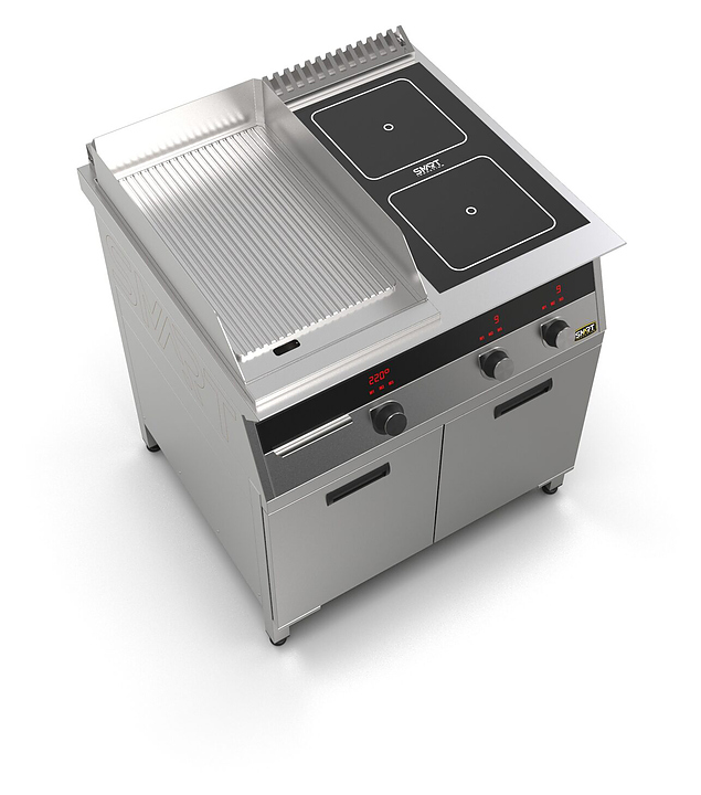Комбинированная индукционная плита SMART INDUCTION K94-35RKB предназначена для приготовления и быстрого разогрева блюд на предприятиях общественного питания и торговли. Модель оснащена электронно-механической панелью управления с цифровой индикацией и сенсорными кнопками, 2 съемными жировыми фильтрами для отделения жира и влаги от поступающего внутрь аппарата воздуха, ящиком для сбора жира и регулируемыми по высоте ножками. Корпус и столешница выполнены из нержавеющей стали AISI430, рабочая поверхность плиты - из стеклокерамики, рабочая поверхность гриля и передняя панель - из нержавеющей стали. Особенности:
