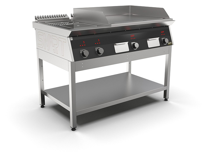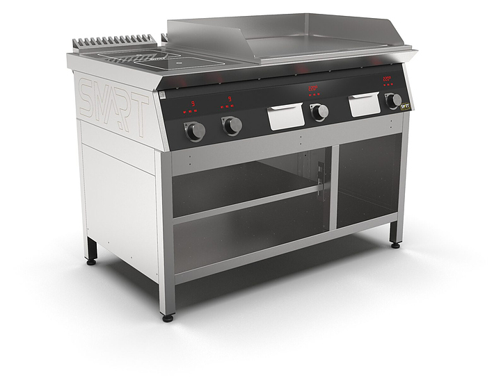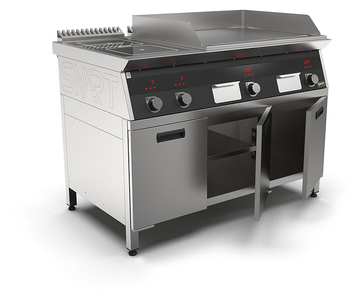 Комбинированная индукционная плита SMART INDUCTION K76-3KPPB предназначена для приготовления и быстрого разогрева блюд на предприятиях общественного питания и торговли. Модель оснащена электронно-механической панелью управления с цифровой индикацией и сенсорными кнопками, 3 съемными жировыми фильтрами для отделения жира и влаги от поступающего внутрь аппарата воздуха, 2 ящиками для сбора жира и регулируемыми по высоте ножками. Корпус и столешница выполнены из нержавеющей стали AISI430, рабочая поверхность плиты - из стеклокерамики, рабочая поверхность гриля - из нержавеющей стали, передняя панель имеет стойкое полимерное покрытие черного цвета. Особенности: