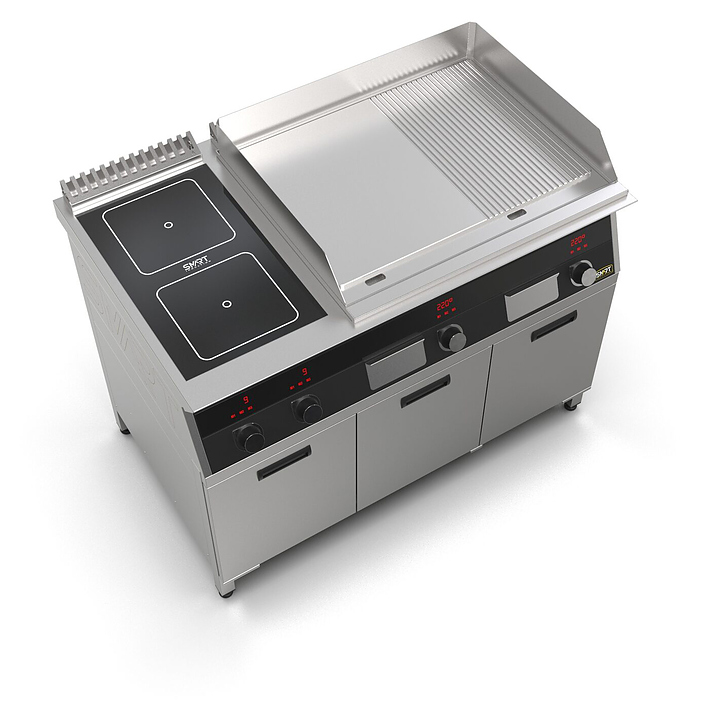 Комбинированная индукционная плита SMART INDUCTION K96-5KPRB предназначена для приготовления и быстрого разогрева блюд на предприятиях общественного питания и торговли. Модель оснащена электронно-механической панелью управления с цифровой индикацией и сенсорными кнопками, 3 съемными жировыми фильтрами для отделения жира и влаги от поступающего внутрь аппарата воздуха, 2 ящиками для сбора жира и регулируемыми по высоте ножками. Корпус и столешница выполнены из нержавеющей стали AISI430, рабочая поверхность плиты - из стеклокерамики, рабочая поверхность гриля - из нержавеющей стали, передняя панель имеет стойкое полимерное покрытие черного цвета. Особенности: