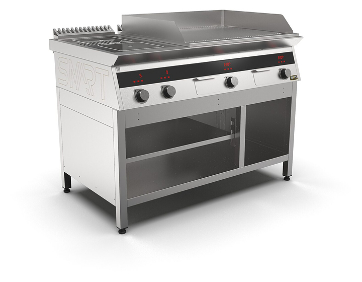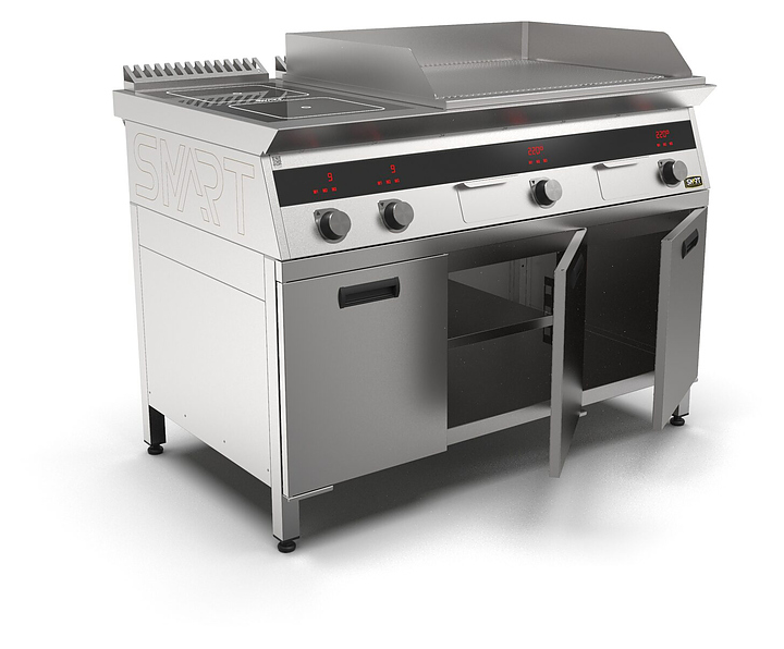 Комбинированная индукционная плита SMART INDUCTION K96-5KRRN предназначена для приготовления и быстрого разогрева блюд на предприятиях общественного питания и торговли. Модель оснащена электронно-механической панелью управления с цифровой индикацией и сенсорными кнопками, 3 съемными жировыми фильтрами для отделения жира и влаги от поступающего внутрь аппарата воздуха, 2 ящиками для сбора жира и регулируемыми по высоте ножками. Корпус и столешница выполнены из нержавеющей стали AISI430, рабочая поверхность плиты - из стеклокерамики, рабочая поверхность гриля и передняя панель - из нержавеющей стали. Особенности: