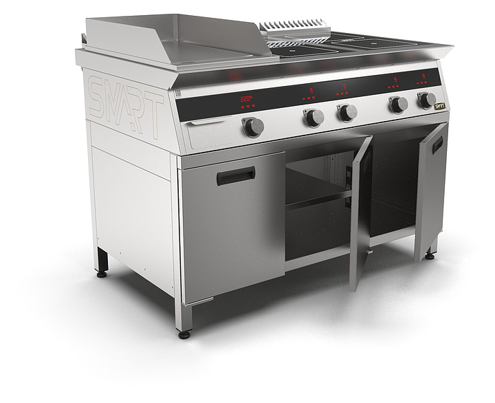 Комбинированная индукционная плита SMART INDUCTION K76-5PKB предназначена для приготовления и быстрого разогрева блюд на предприятиях общественного питания и торговли. Модель оснащена электронно-механической панелью управления с цифровой индикацией и сенсорными кнопками, 3 съемными жировыми фильтрами для отделения жира и влаги от поступающего внутрь аппарата воздуха, 2 ящиками для сбора жира и регулируемыми по высоте ножками. Корпус и столешница выполнены из нержавеющей стали AISI430, рабочая поверхность плиты - из стеклокерамики, рабочая поверхность гриля и передняя панель - из нержавеющей стали. Особенности: