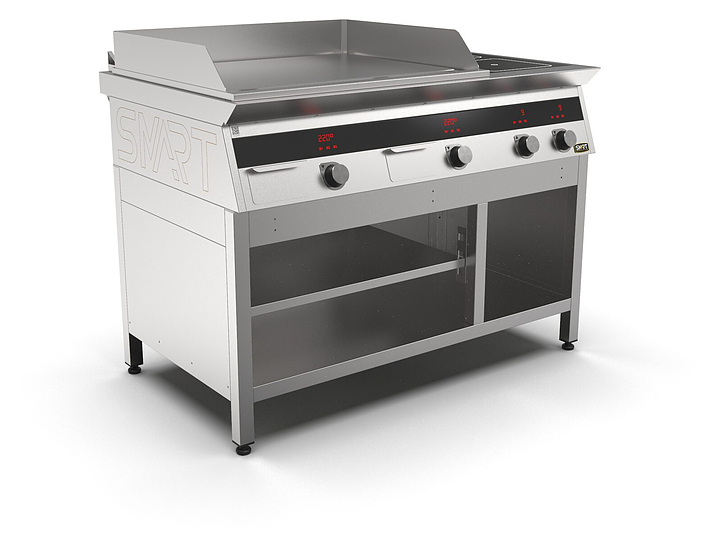 Комбинированная индукционная плита SMART INDUCTION K76-5PPKN предназначена для приготовления и быстрого разогрева блюд на предприятиях общественного питания и торговли. Модель оснащена электронно-механической панелью управления с цифровой индикацией и сенсорными кнопками, 3 съемными жировыми фильтрами для отделения жира и влаги от поступающего внутрь аппарата воздуха, 2 ящиками для сбора жира и регулируемыми по высоте ножками. Корпус и столешница выполнены из нержавеющей стали AISI430, рабочая поверхность плиты - из стеклокерамики, рабочая поверхность гриля и передняя панель - из нержавеющей стали. Особенности: