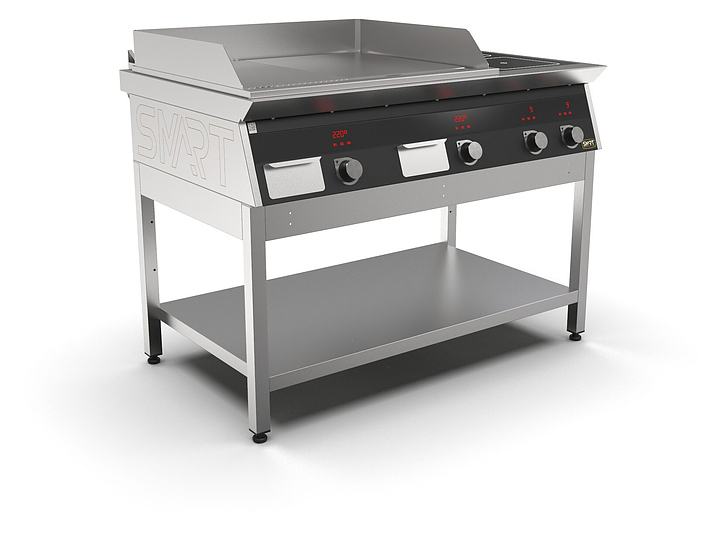 Комбинированная индукционная плита SMART INDUCTION K76-35RPKB предназначена для приготовления и быстрого разогрева блюд на предприятиях общественного питания и торговли. Модель оснащена электронно-механической панелью управления с цифровой индикацией и сенсорными кнопками, 3 съемными жировыми фильтрами для отделения жира и влаги от поступающего внутрь аппарата воздуха, 2 ящиками для сбора жира и регулируемыми по высоте ножками. Корпус и столешница выполнены из нержавеющей стали AISI430, рабочая поверхность плиты - из стеклокерамики, рабочая поверхность гриля - из нержавеющей стали, передняя панель имеет стойкое полимерное покрытие черного цвета. Особенности: