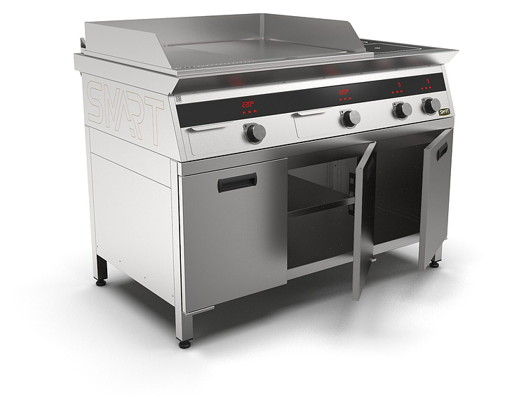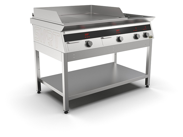 Комбинированная индукционная плита SMART INDUCTION K76-35RPKN предназначена для приготовления и быстрого разогрева блюд на предприятиях общественного питания и торговли. Модель оснащена электронно-механической панелью управления с цифровой индикацией и сенсорными кнопками, 3 съемными жировыми фильтрами для отделения жира и влаги от поступающего внутрь аппарата воздуха, 2 ящиками для сбора жира и регулируемыми по высоте ножками. Корпус и столешница выполнены из нержавеющей стали AISI430, рабочая поверхность плиты - из стеклокерамики, рабочая поверхность гриля и передняя панель - из нержавеющей стали. Особенности:
