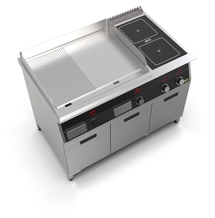 Комбинированная индукционная плита SMART INDUCTION K76-5RPKB предназначена для приготовления и быстрого разогрева блюд на предприятиях общественного питания и торговли. Модель оснащена электронно-механической панелью управления с цифровой индикацией и сенсорными кнопками, 3 съемными жировыми фильтрами для отделения жира и влаги от поступающего внутрь аппарата воздуха, 2 ящиками для сбора жира и регулируемыми по высоте ножками. Корпус и столешница выполнены из нержавеющей стали AISI430, рабочая поверхность плиты - из стеклокерамики, рабочая поверхность гриля - из нержавеющей стали, передняя панель имеет стойкое полимерное покрытие черного цвета. Особенности: