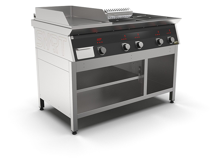 Комбинированная индукционная плита SMART INDUCTION K96-3PKB предназначена для приготовления и быстрого разогрева блюд на предприятиях общественного питания и торговли. Модель оснащена электронно-механической панелью управления с цифровой индикацией и сенсорными кнопками, 3 съемными жировыми фильтрами для отделения жира и влаги от поступающего внутрь аппарата воздуха, 2 ящиками для сбора жира и регулируемыми по высоте ножками. Корпус и столешница выполнены из нержавеющей стали AISI430, рабочая поверхность плиты - из стеклокерамики, рабочая поверхность гриля - из нержавеющей стали, передняя панель имеет стойкое полимерное покрытие черного цвета. Особенности: