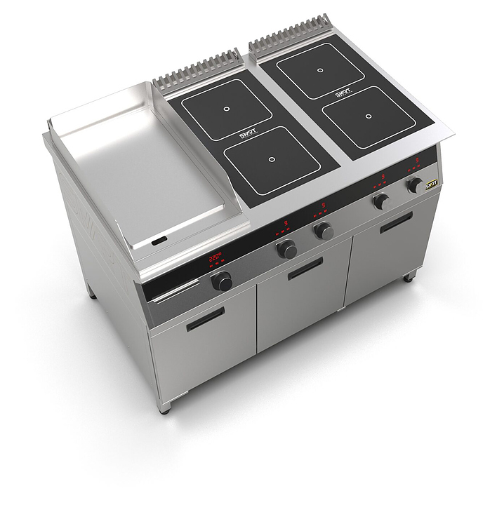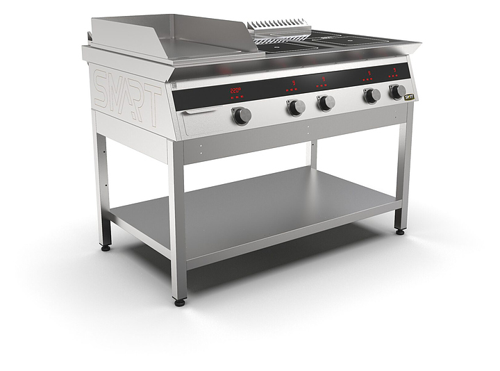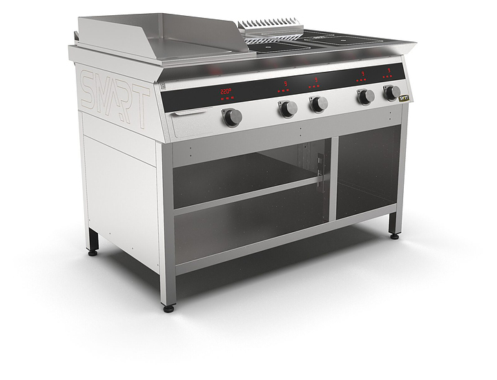 Комбинированная индукционная плита SMART INDUCTION K96-3PKN предназначена для приготовления и быстрого разогрева блюд на предприятиях общественного питания и торговли. Модель оснащена электронно-механической панелью управления с цифровой индикацией и сенсорными кнопками, 3 съемными жировыми фильтрами для отделения жира и влаги от поступающего внутрь аппарата воздуха, 2 ящиками для сбора жира и регулируемыми по высоте ножками. Корпус и столешница выполнены из нержавеющей стали AISI430, рабочая поверхность плиты - из стеклокерамики, рабочая поверхность гриля и передняя панель - из нержавеющей стали. Особенности: