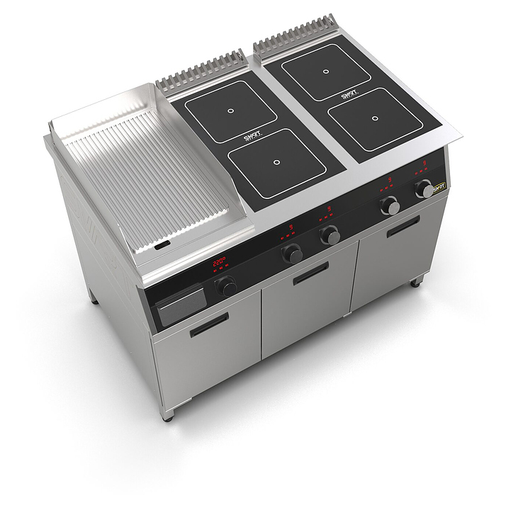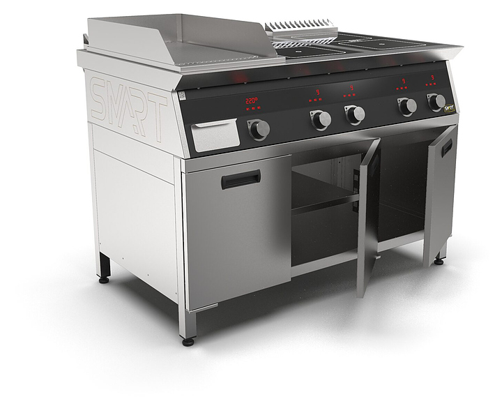Комбинированная индукционная плита SMART INDUCTION K96-5RKB предназначена для приготовления и быстрого разогрева блюд на предприятиях общественного питания и торговли. Модель оснащена электронно-механической панелью управления с цифровой индикацией и сенсорными кнопками, 3 съемными жировыми фильтрами для отделения жира и влаги от поступающего внутрь аппарата воздуха, 2 ящиками для сбора жира и регулируемыми по высоте ножками. Корпус и столешница выполнены из нержавеющей стали AISI430, рабочая поверхность плиты - из стеклокерамики, рабочая поверхность гриля - из нержавеющей стали, передняя панель имеет стойкое полимерное покрытие черного цвета. Особенности: