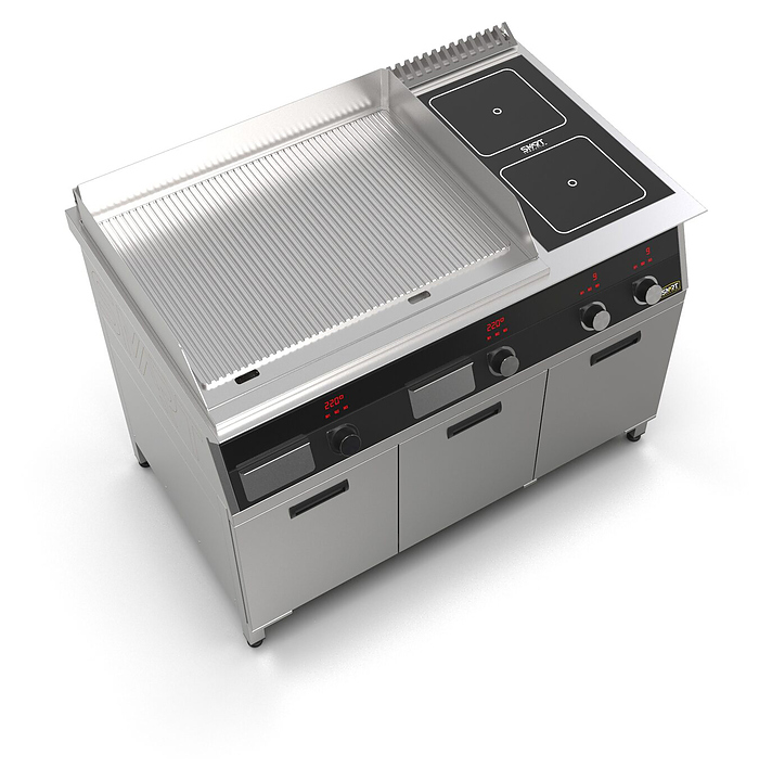 Комбинированная индукционная плита SMART INDUCTION K96-5RRKB предназначена для приготовления и быстрого разогрева блюд на предприятиях общественного питания и торговли. Модель оснащена электронно-механической панелью управления с цифровой индикацией и сенсорными кнопками, 3 съемными жировыми фильтрами для отделения жира и влаги от поступающего внутрь аппарата воздуха, 2 ящиками для сбора жира и регулируемыми по высоте ножками. Корпус и столешница выполнены из нержавеющей стали AISI430, рабочая поверхность плиты - из стеклокерамики, рабочая поверхность гриля - из нержавеющей стали, передняя панель имеет стойкое полимерное покрытие черного цвета. Особенности:
