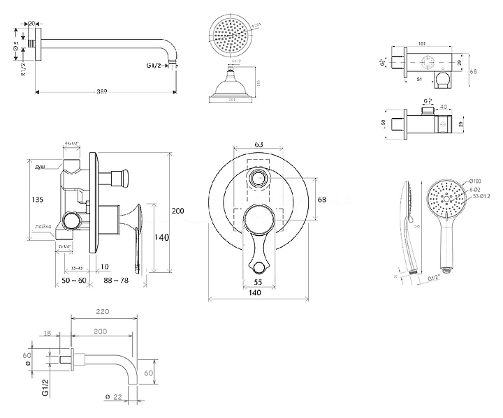 Комплект душевой Bronze de Luxe Perse NT9055-OR-3 встраиваемый, хром