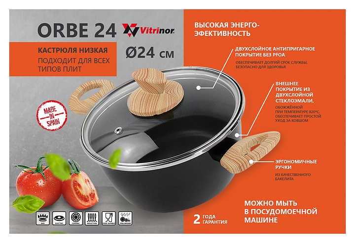Низкая кастрюля Vitrinor Orbe 24 используется на предприятиях общественного питания и торговли, а также в домашних условиях для приготовления широкого спектра блюд на любых типах варочных поверхностей, включая индукционные. Модель оснащена стеклянной крышкой с ободком из нержавеющей стали и отверстием для выпуска пара. Изделие выполнено из стали c ферромагнитными свойствами с двухслойным антипригарным покрытием, не содержащим PFOA, внешнее покрытие - двухслойная стеклоэмаль, обожженная при температуре 820 °С, черного цвета, ручки - из бакелита. Особенности: