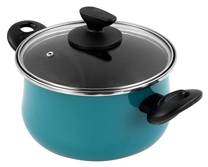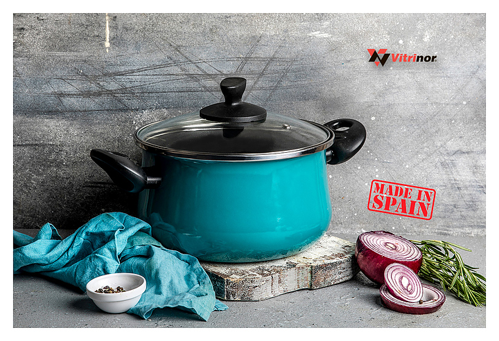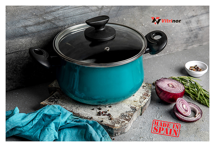 Кастрюля Vitrinor Country 24 используется на предприятиях общественного питания и торговли, а также в домашних условиях для приготовления широкого спектра блюд на любых типах варочных поверхностей, включая индукционные. Модель оснащена стеклянной крышкой с ободком из нержавеющей стали и отверстием для выпуска пара. Изделие выполнено из стали c ферромагнитными свойствами с двухслойным антипригарным покрытием, не содержащим PFOA, внешнее покрытие - двухслойная стеклоэмаль, обожженная при температуре 820 °С, бирюзового цвета, ручки - из бакелита. Особенности: