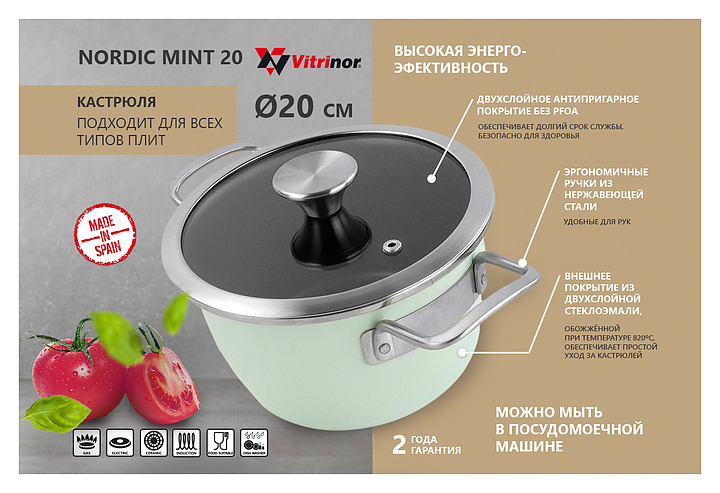 Кастрюля Vitrinor Nordic Mint 20 используется на предприятиях общественного питания и торговли, а также в домашних условиях для приготовления широкого спектра блюд на любых типах варочных поверхностей, включая индукционные. Модель оснащена стеклянной крышкой с ободком из нержавеющей стали и отверстием для выпуска пара. Изделие выполнено из стали c ферромагнитными свойствами с двухслойным антипригарным покрытием, не содержащим PFOA, внешнее покрытие - двухслойная стеклоэмаль, обожженная при температуре 820 °С, мятного цвета, ручки - из нержавеющей стали. Особенности: