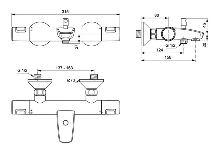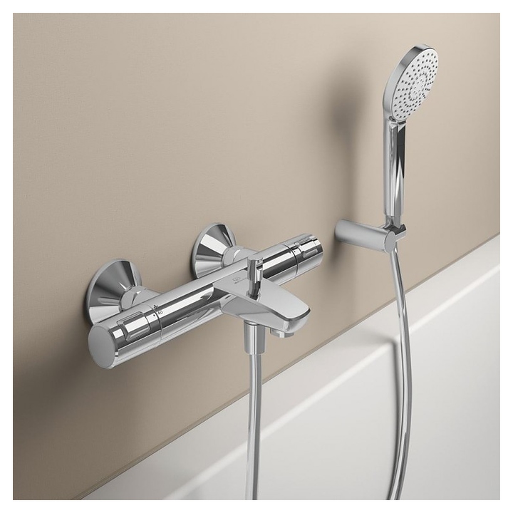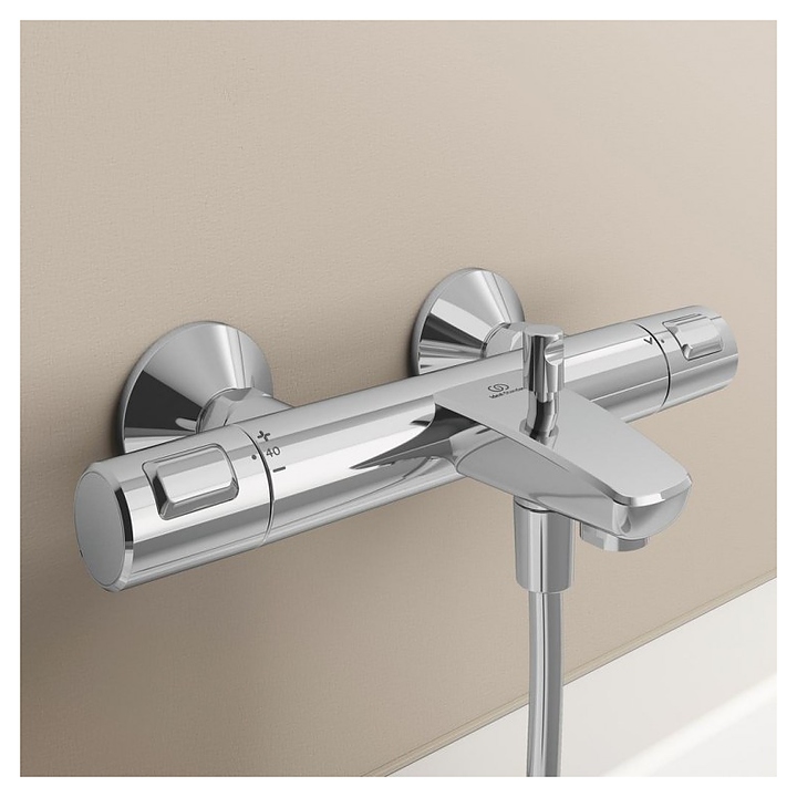 Смеситель для ванны с душем Ideal Standard CERATHERM T25 A7206AA предназначен для подачи горячей и холодной воды в ванных помещениях. Термостатический картридж обеспечивает поддержание необходимой температуры вне зависимости от давления воды и защитой от обратного потока. Изделие выполнено из высококачественной латуни, которая отличается прочностью, долговечностью и устойчивостью к перепадам температур. Дополнительные характеристики: