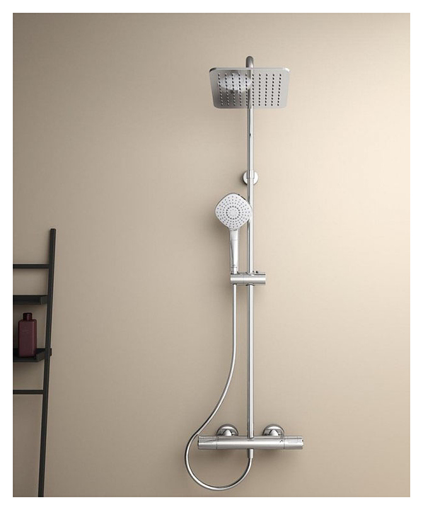 Душевая стойка Ideal Standard CERATHERM T100 A7240AA используется в ванных комнатах. Модель оснащена квадратным верхним душем и ромбовидной лейкой. Термостатический картридж обеспечивает подачу воды заданной температуры, что исключает ожоги. Стойка имеет функцию экономии воды и защиту от обратного потока. Изделие выполнено из латуни, которая отличается прочностью, долговечностью и устойчивостью к перепадам температур. Дополнительные характеристики:
