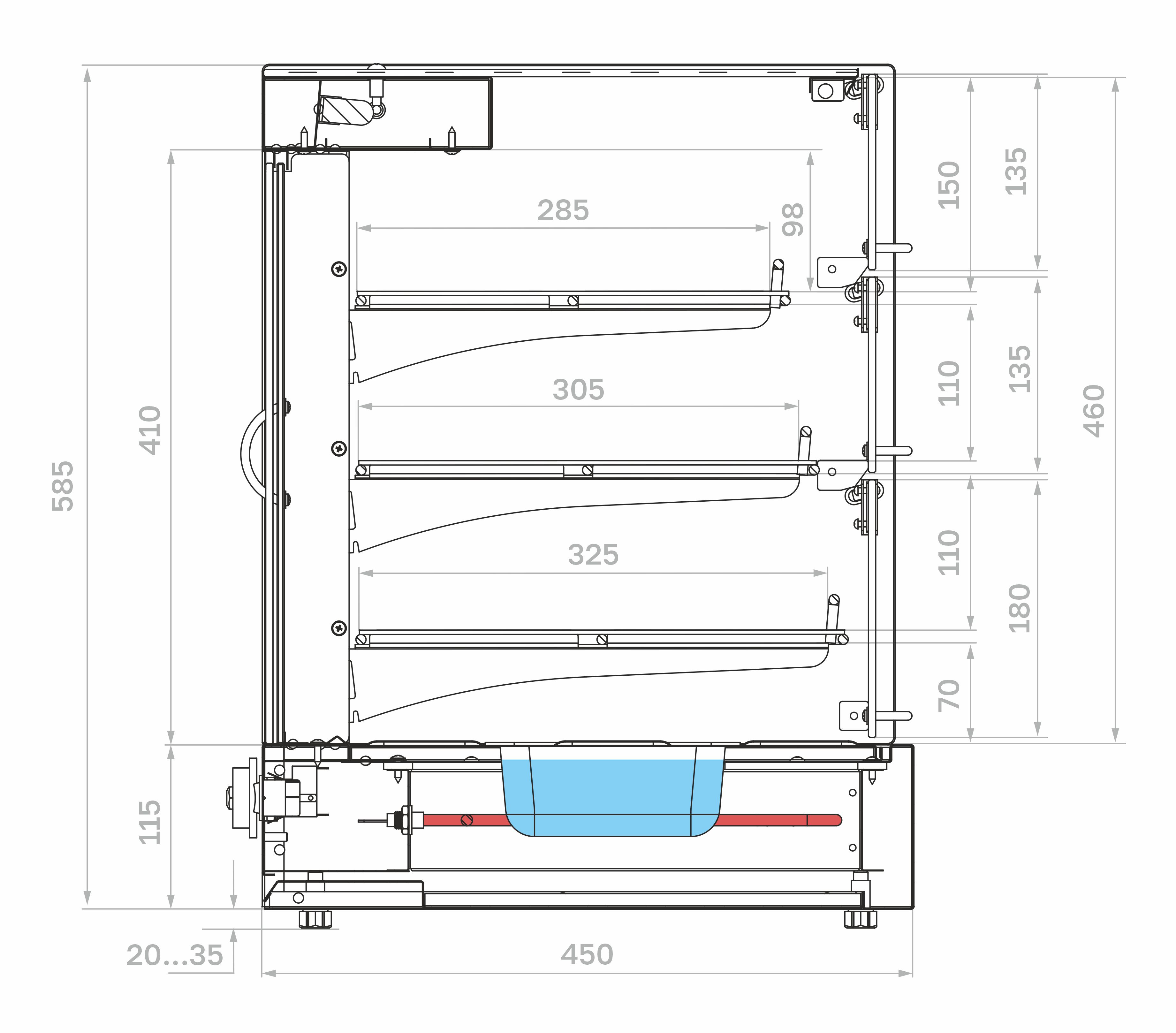 Тепловая витрина Carboma AC45 HWB 0,9-1 (self) серии Asia используется в небольших барах и кафе, на предприятиях общественного питания и торговли для поддержания в горячем состоянии, кратковременного хранения, демонстрации и продажи различных закусок и блюд, пиццы и выпечки. Модель оснащена системой пароувлажнения (типа мармит), задними створками-слайдерами, 3 полками-решетками с возможностью регулирования угла, термометром, термостатом и выдвижным поддоном для сбора крошек. Корпус и полки выполнены из нержавеющей стали. Особенности: