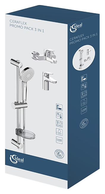 Душевой комплект Ideal Standard CERAFLEX BD001AA предназначен для использования в ванных помещениях. Модель оснащена круглой ручной лейкой и экономией воды. Однорычажное управление позволяет быстро и точно выбирать напор и температуру воды. Изделие выполнено из высококачественной латуни, отличающейся прочностью, долговечностью и устойчивостью к перепадам температуры, держатель - из пластика, покрытие шланга - из силикона. В комплект поставки входят смеситель для раковины CERAFLEX Grande B1713AA, смеситель для ванны и душа CERAFLEX B1721AA, душевой гарнитур IDEALRAIN EVO ROUND L3 B2620AA, держатель и мыльница. Дополнительные характеристики: