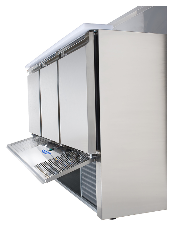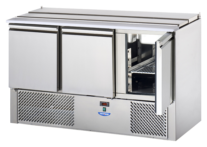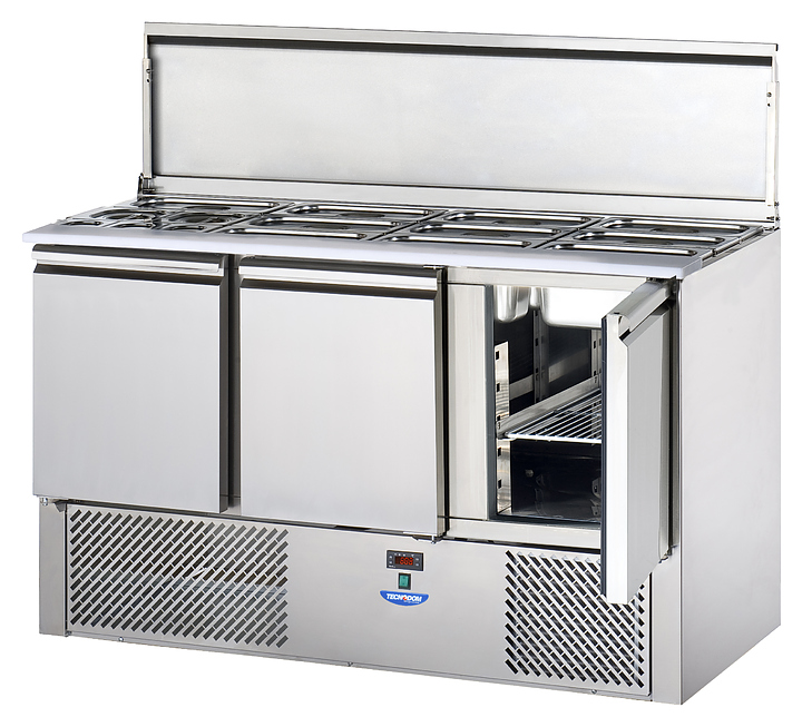 Стол для салатов Tecnodom SLV03EKO используется на предприятиях общественного питания и торговли для обработки ингредиентов, используемых для приготовления пиццы, салатов и других блюд, а также для охлаждения и кратковременного хранения скоропортящихся продуктов и напитков. Модель оснащена электронной панелью управления с NTC датчиком, крышкой и бортом из полиэтилена. Корпус, за исключением агрегатного отсека, и крышка выполнены из нержавеющей стали, теплоизоляция - полиуретан, впрыскиваемый под высоким давлением. Особенности: