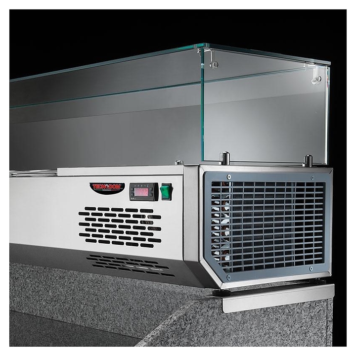 Холодильная витрина Tecnodom VR4190VD используется на предприятиях общественного питания и торговли для охлаждения и кратковременного хранения салатов, закусок, ингредиентов для пиццы. Модель оснащена защитным экраном из закаленного стекла. Корпус выполнен из нержавеющей стали. Витрина используется совместно со столом Tecnodom SLV03C6. Гастроемкости в комплект поставки не входят и приобретаются отдельно. Особенности: