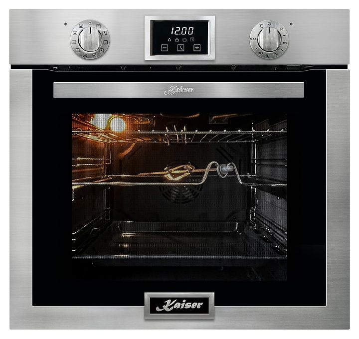 Электрический духовой шкаф Kaiser EH 6323 предназначен для приготовления большого ассортимента блюд в домашних условиях. Модель оснащена рабочей камерой с верхним и нижним нагревательными элементамии, грилем, расположенными в задней стенке кольцевым нагревателем и вентилятором, элетродвигателем с вращающимся приводом, 2 съемными стойками с 5 уровнями направляющих для противней, откидной дверью со смотровым окном и длинной горизонтальной рукояткой, электромеханической панелью управления с 2 поворотными переключателями, программатором Touch Control и светодиодным цифровым дисплеем с белой подсветкой индикации. Корпус выполнен из высококачественной стали, фронт и фурнитура – из металла цвета нержавеющей с защитной обработкой от отпечатков пальцев, остекление – из прозрачного стекла с глянцевой поверхностью без винтового крепежа, направляющие, решетка, вертел и подставка – из нержавеющей стали с глянцевой поверхностью, противни – из эмалированного металла. В комплект поставки входят 2 противня: стандартный и глубокий, опущенная решетка с ограничителем для емкостей, ухват для противней, вертел и подставка для вертела. Особенности: