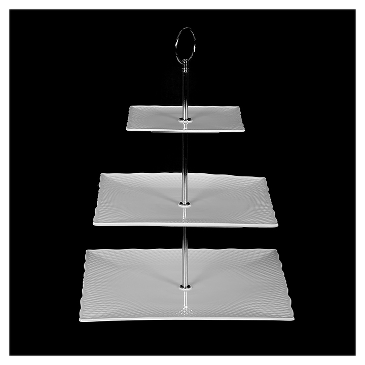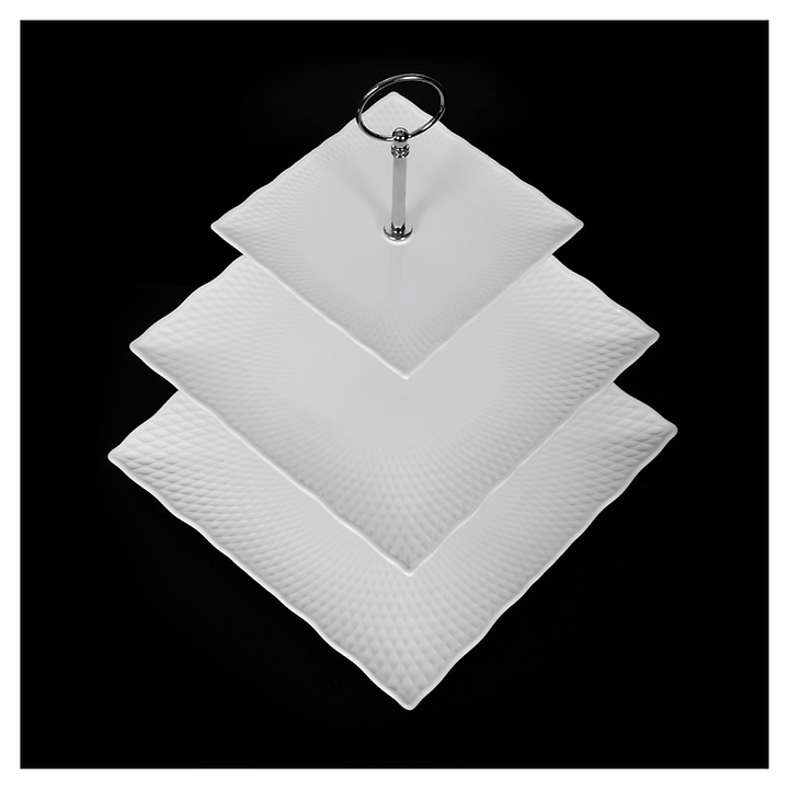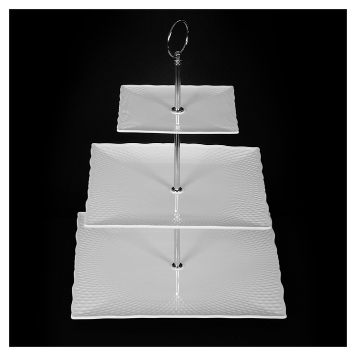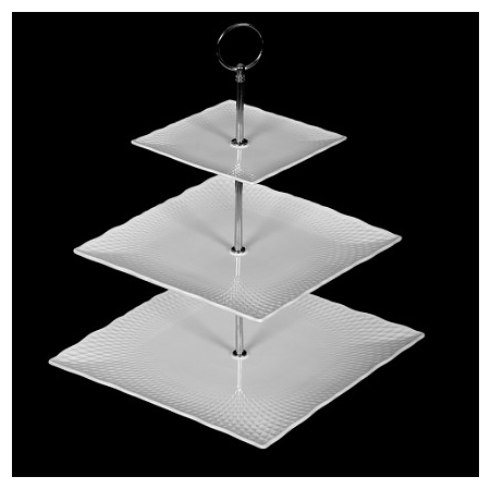 Этажерка Sam&Squito 106J 19-950096 серии Quadro предназначена для предпродажной выкладки и подачи в процессе сервировки стола хлебобулочных изделий, колбас, сыров, различных закусок и других продуктов на предприятиях общественного питания и торговли, а также в домашних условиях. Модель оснащена опорным стержнем с кольцеобразной рукояткой, 3 ярусами тарелок квадратной формы с декоративным рельефом и фигурной кромкой. Тарелки выполнены из высококачественного фарфора белого цвета с глянцевой поверхностью, опорный стержень – из металла с серебристой поверхностью. Особенности: