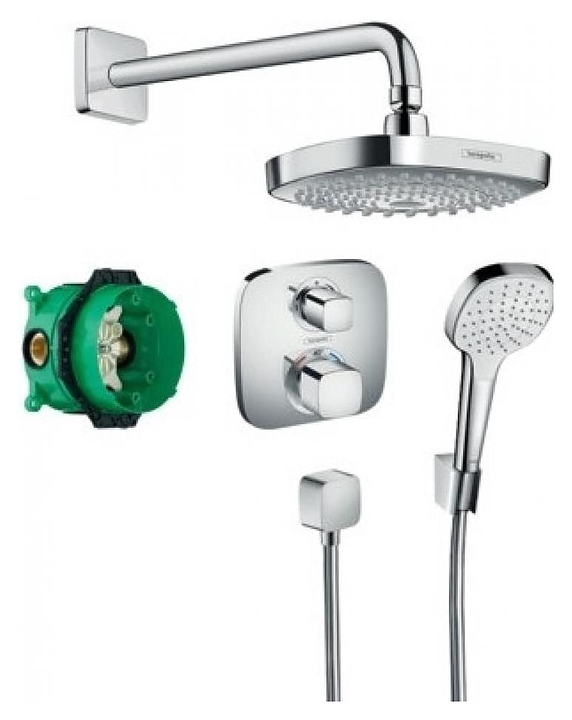 Душевой комплект Hansgrohe Croma Select E 27294000 HG Set используется в ванных комнатах. Модель оснащена верхним тропическим душем, ручной лейкой с душевым шлангом с защитой от перекручивания и настенным держателем, термостатическим картриджем, обеспечивающим поддержание заданной температуры и силы потока, независимо от того, как в системе меняется давление. Благодаря технологии QuickClean известковый налет и грязь легко убрать, достаточно просто протереть поверхность мягкой влажной тканью. Комплектация:
