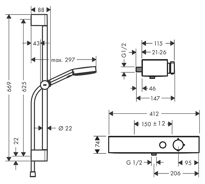 Гарнитур душевой с термостатом Hansgrohe HG Pulsify Relaxation 105 3 jet 24260000 хром