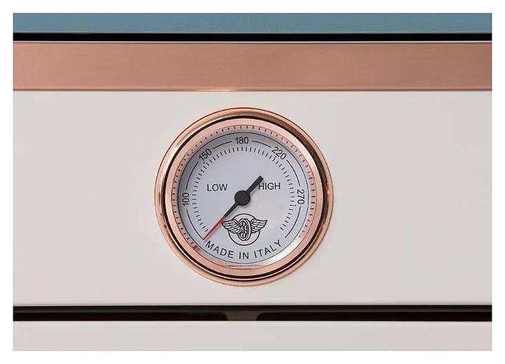 Электрический духовой шкаф Bertazzoni F609HEREKTAC предназначен для приготовления большого ассортимента блюд в домашних условиях. Модель оснащена вместительной камерой и вентилятором в задней стенке, грилем, герметичной дверью с прямоугольным смотровым окном, горизонтальной рукояткой, 2 поворотными регуляторами и аналоговым термометром с круглым циферблатом. Ручка дверцы выполнена из металла, внутренняя поверхность духового шкафа покрыта серой пиролитической эмалью, фурнитура – из металла цвета меди. В комплект поставки входят стандартный противень, усиленная и глубокая решетки для гриля. Особенности: