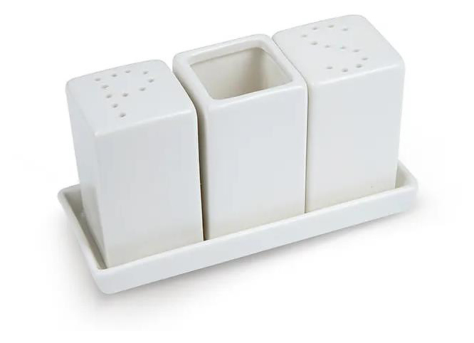 Набор для специй Lambert 3 предмета предназначен для использования на предприятиях общественного питания и торговли, а также в частных домах, квартирах, отелях и офисах. Комплект состоит из трех емкостей прямоугольной формы: для соли, перца и зубочисток и подставки. Изделия выполнены из фарфора.