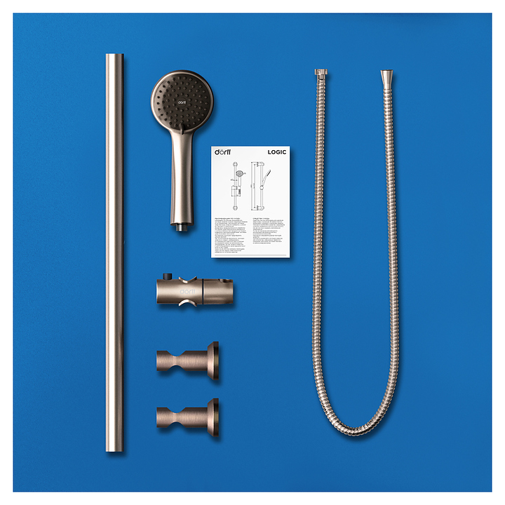Душевой гарнитур Dorff Logic D0103000SS используется в ванных комнатах. Модель оснащена душевой штангой, ручной лейкой с душевым шлангом и держателем для ручного душа. Изделие выполнено из нержавеющей стали, лейка - из ABS-пластика. В комплект поставки входят штанга, ручной душ, шланг и держатель для душа. Особенности: