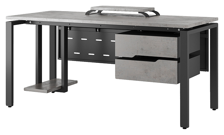 Офисный стол Кобор P-100/60 black/chicago используется в офисных помещениях и кабинетах руководителей. Модель оснащена П-образными опорами. Каркас выполнен из металла, выкрашенного в цвет черный муар (RAL9005), столешница – из ламинированной древесно-стружечной плиты (ЛДСП) цвета бетон чикаго (F186 ST9).