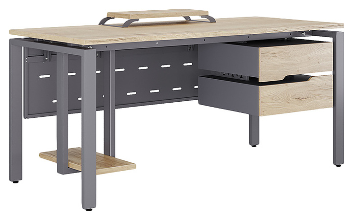 Офисный стол Кобор P-100/80 graphite/natural используется в офисных помещениях и кабинетах руководителей. Модель оснащена П-образными опорами. Каркас выполнен из металла, выкрашенного в цвет графит муар (RAL7024), столешница – из ламинированной древесно-стружечной плиты (ЛДСП) цвета натуральный дуб (H1180 ST37). Опции (заказываются отдельно):