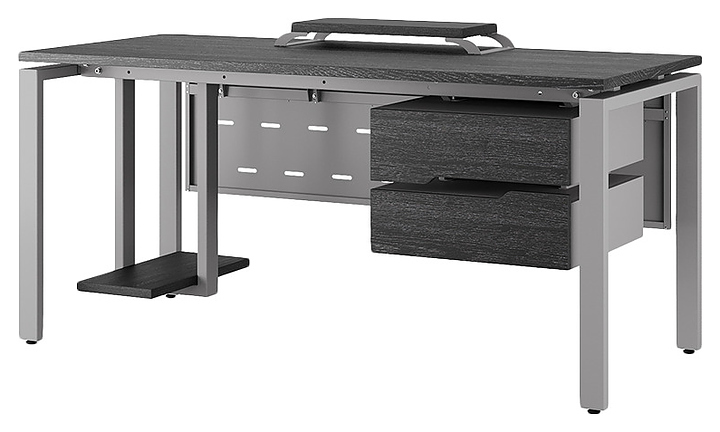 Офисный стол Кобор P-180/60 aluminum/glazed используется в офисных помещениях и кабинетах руководителей. Модель оснащена П-образными опорами. Каркас выполнен из металла, выкрашенного в цвет алюминиевый металлик (RAL9006), столешница – из ламинированной древесно-стружечной плиты (ЛДСП) цвета черный дуб (H3178 ST37). Опции (заказываются отдельно):