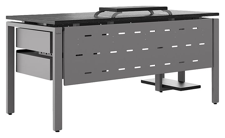 Офисный стол Кобор P-100/70 aluminum/glazed используется в офисных помещениях и кабинетах руководителей. Модель оснащена П-образными опорами. Каркас выполнен из металла, выкрашенного в цвет алюминиевый металлик (RAL9006), столешница – из ламинированной древесно-стружечной плиты (ЛДСП) цвета черный дуб (H3178 ST37). Опции (заказываются отдельно):