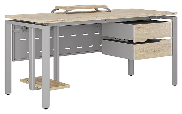 Офисный стол Кобор P-140/80 aluminum/natural используется в офисных помещениях и кабинетах руководителей. Модель оснащена П-образными опорами. Каркас выполнен из металла, выкрашенного в цвет алюминиевый металлик (RAL9006), столешница – из ламинированной древесно-стружечной плиты (ЛДСП) цвета натуральный дуб (H1180 ST37). Опции (заказываются отдельно):