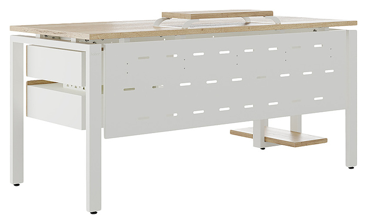 Офисный стол Кобор P-140/80 white/natural используется в офисных помещениях и кабинетах руководителей. Модель оснащена П-образными опорами. Каркас выполнен из металла, выкрашенного в цвет белый муар (RAL9016), столешница – из ламинированной древесно-стружечной плиты (ЛДСП) цвета натуральный дуб (H1180 ST37). Опции (заказываются отдельно):