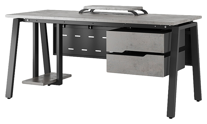 Офисный стол Кобор A-160/80 black/chicago используется в офисных помещениях и кабинетах руководителей. Модель оснащена A-образными опорами. Каркас выполнен из металла, выкрашенного в цвет черный муар (RAL9005), столешница – из ламинированной древесно-стружечной плиты (ЛДСП) цвета бетон чикаго (F186 ST9). Опции (заказываются отдельно):
