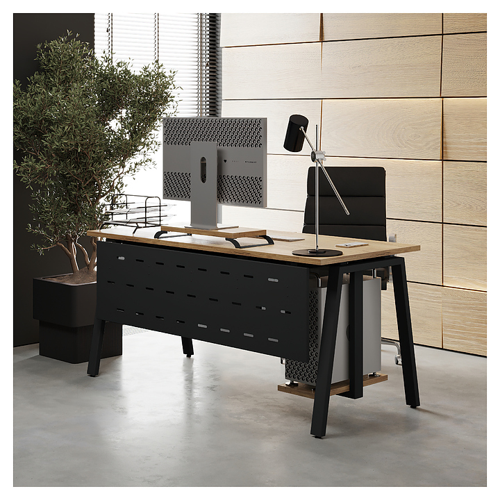 Офисный стол Кобор A-140/70 black/natural используется в офисных помещениях и кабинетах руководителей. Модель оснащена A-образными опорами. Каркас выполнен из металла, выкрашенного в цвет черный муар (RAL9005), столешница – из ламинированной древесно-стружечной плиты (ЛДСП) цвета натуральный дуб (H1180 ST37). Опции (заказываются отдельно):