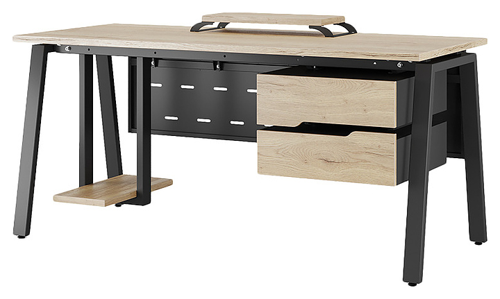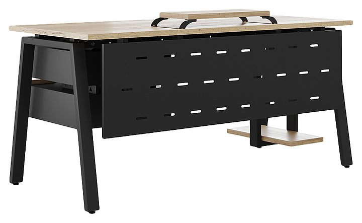 Офисный стол Кобор A-80/80 black/natural используется в офисных помещениях и кабинетах руководителей. Модель оснащена A-образными опорами. Каркас выполнен из металла, выкрашенного в цвет черный муар (RAL9005), столешница – из ламинированной древесно-стружечной плиты (ЛДСП) цвета натуральный дуб (H1180 ST37). Опции (заказываются отдельно):