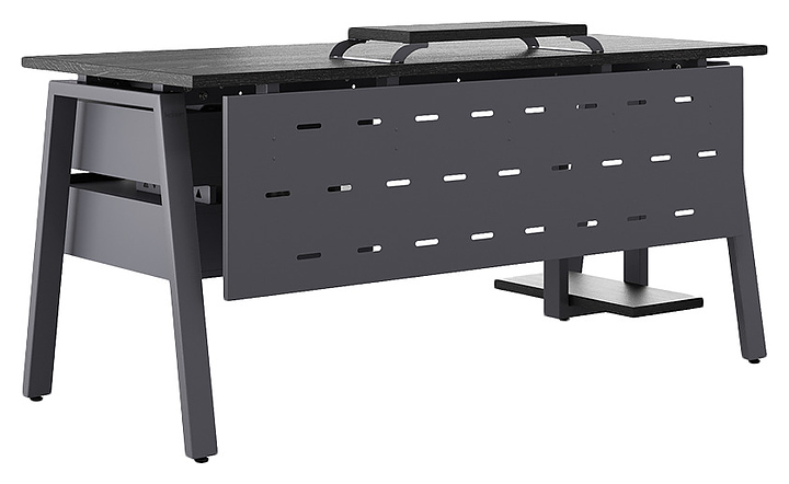 Офисный стол Кобор A-100/60 graphite/glazed используется в офисных помещениях и кабинетах руководителей. Модель оснащена A-образными опорами. Каркас выполнен из металла, выкрашенного в цвет графит муар (RAL7024), столешница – из ламинированной древесно-стружечной плиты (ЛДСП) цвета черный дуб (H3178 ST37). Опции (заказываются отдельно):