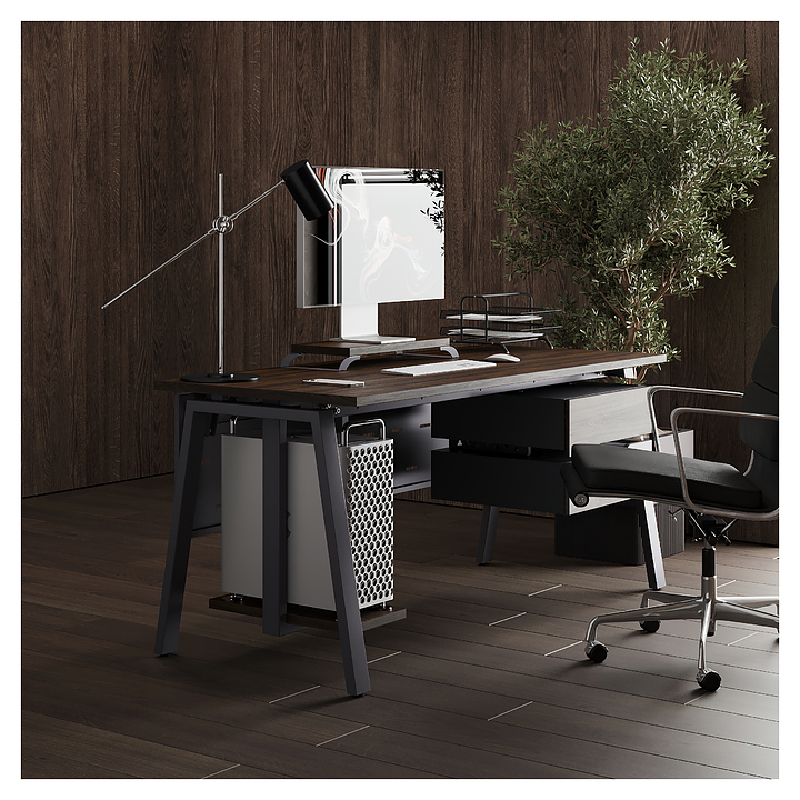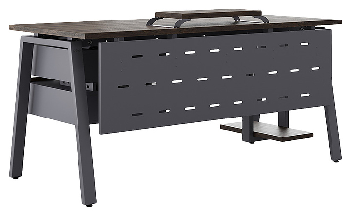 Офисный стол Кобор A-160/80 graphite/charlston используется в офисных помещениях и кабинетах руководителей. Модель оснащена A-образными опорами. Каркас выполнен из металла, выкрашенного в цвет графит муар (RAL7024), столешница – из ламинированной древесно-стружечной плиты (ЛДСП) цвета дуб чарльстон (H3154 ST36). Опции (заказываются отдельно):