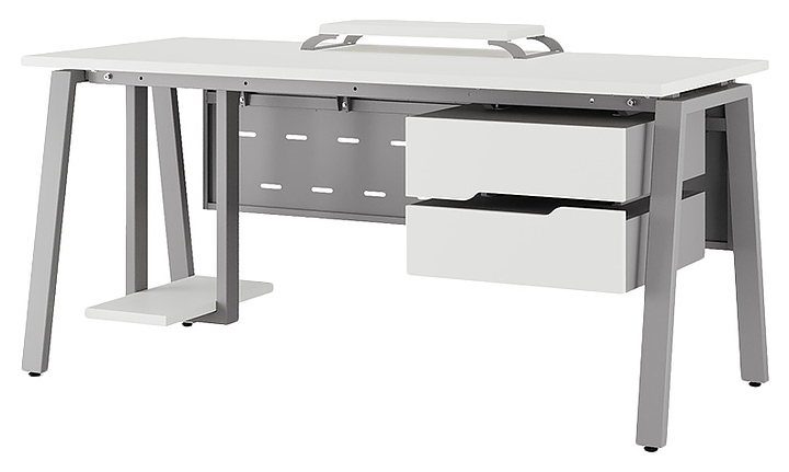 Офисный стол Кобор A-160/60 aluminum/premium используется в офисных помещениях и кабинетах руководителей. Модель оснащена A-образными опорами. Каркас выполнен из металла, выкрашенного в цвет алюминиевый металлик (RAL9006), столешница – из ламинированной древесно-стружечной плиты (ЛДСП) цвета белый премиум (W1000 ST9). Опции (заказываются отдельно):