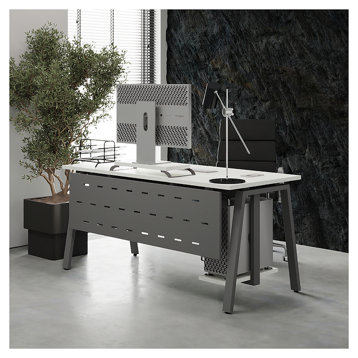 Офисный стол Кобор A-140/70 aluminum/premium используется в офисных помещениях и кабинетах руководителей. Модель оснащена A-образными опорами. Каркас выполнен из металла, выкрашенного в цвет алюминиевый металлик (RAL9006), столешница – из ламинированной древесно-стружечной плиты (ЛДСП) цвета белый премиум (W1000 ST9). Опции (заказываются отдельно):