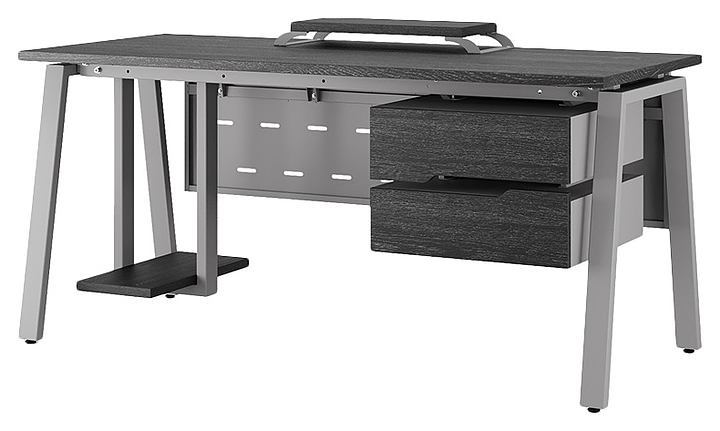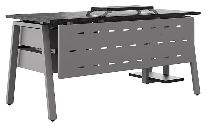 Офисный стол Кобор A-160/60 aluminum/glazed используется в офисных помещениях и кабинетах руководителей. Модель оснащена A-образными опорами. Каркас выполнен из металла, выкрашенного в цвет алюминиевый металлик (RAL9006), столешница – из ламинированной древесно-стружечной плиты (ЛДСП) цвета черный дуб (H3178 ST37). Опции (заказываются отдельно):