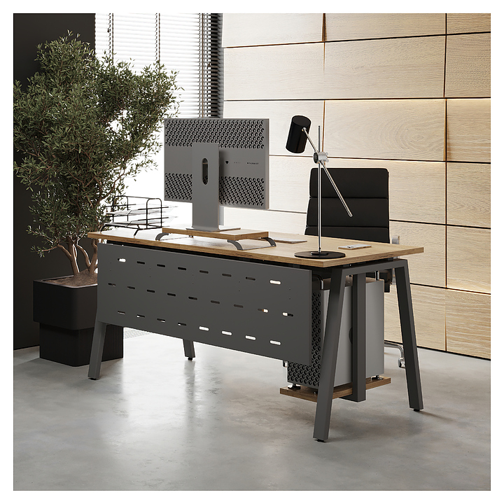 Офисный стол Кобор A-100/70 aluminum/natural используется в офисных помещениях и кабинетах руководителей. Модель оснащена A-образными опорами. Каркас выполнен из металла, выкрашенного в цвет алюминиевый металлик (RAL9006), столешница – из ламинированной древесно-стружечной плиты (ЛДСП) цвета натуральный дуб (H1180 ST37). Опции (заказываются отдельно):