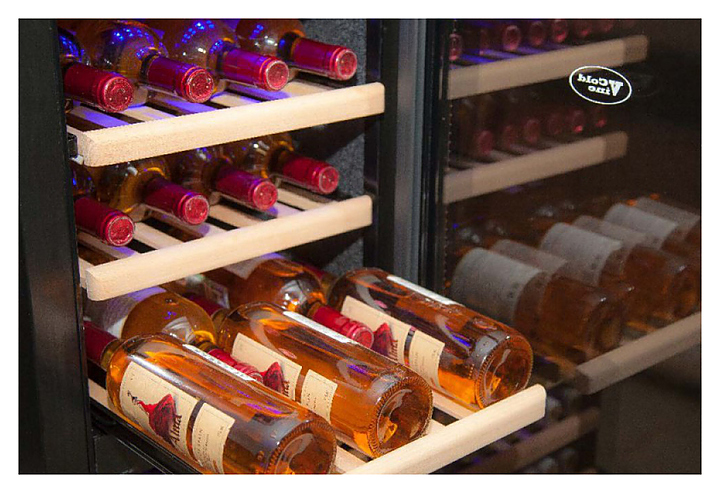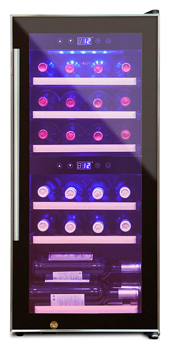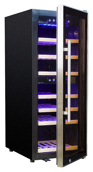 Винный шкаф Cold Vine C38-KBF2 создает оптимальные условия для сохранения всех вкусовых свойств разливного вина. Модель оснащена 7 деревянными полками без лакового покрытия, 6 из которых оснащены метабоксами, и голубой светодиодной подсветкой. Дверь выполнена в черной стальной окантовке и двойного тонированного стекла с защитой от УФ-лучей. Особенности: