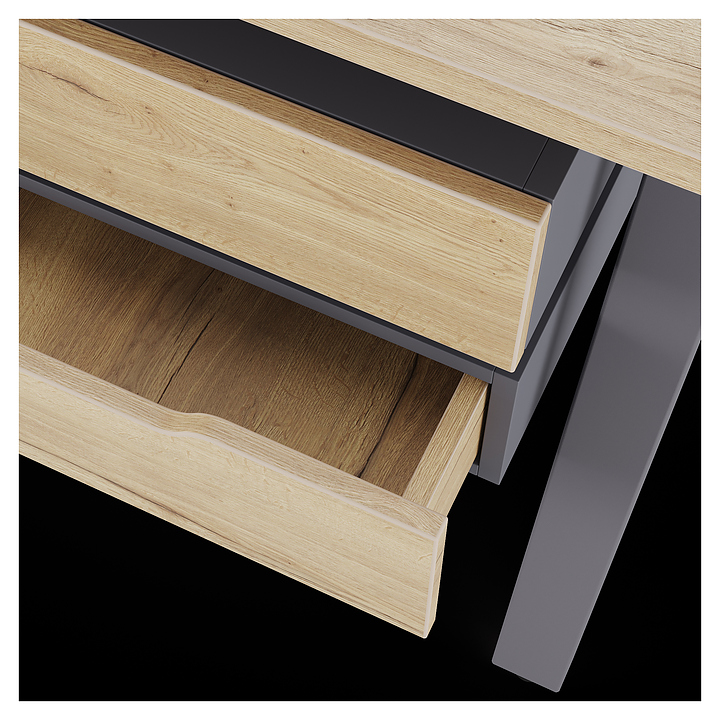 Офисный стол Кобор AB-180/70 graphite/natural используется в офисных помещениях и кабинетах руководителей. Модель оснащена A-образными опорами со скошенными фронтальными сегментами. Каркас выполнен из металла, выкрашенного в цвет графит муар (RAL7024), столешница – из ламинированной древесно-стружечной плиты (ЛДСП) цвета натуральный дуб (H1180 ST37). Опции (заказываются отдельно):