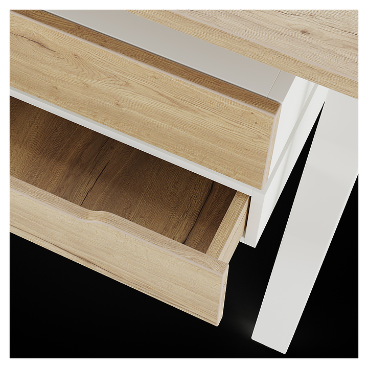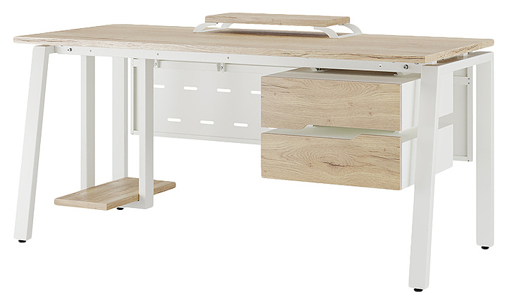 Офисный стол Кобор AB-100/80 white/natural используется в офисных помещениях и кабинетах руководителей. Модель оснащена A-образными опорами со скошенными фронтальными сегментами. Каркас выполнен из металла, выкрашенного в цвет белый муар (RAL9016), столешница – из ламинированной древесно-стружечной плиты (ЛДСП) цвета натуральный дуб (H1180 ST37). Опции (заказываются отдельно):