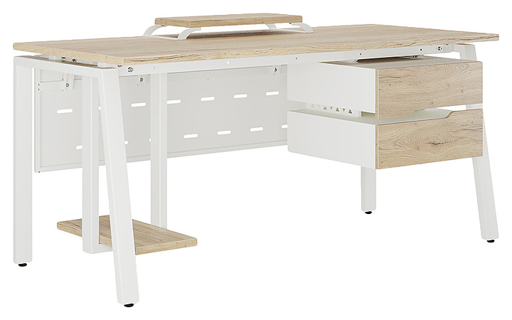 Офисный стол Кобор AB-140/80 white/natural используется в офисных помещениях и кабинетах руководителей. Модель оснащена A-образными опорами со скошенными фронтальными сегментами. Каркас выполнен из металла, выкрашенного в цвет белый муар (RAL9016), столешница – из ламинированной древесно-стружечной плиты (ЛДСП) цвета натуральный дуб (H1180 ST37). Опции (заказываются отдельно):