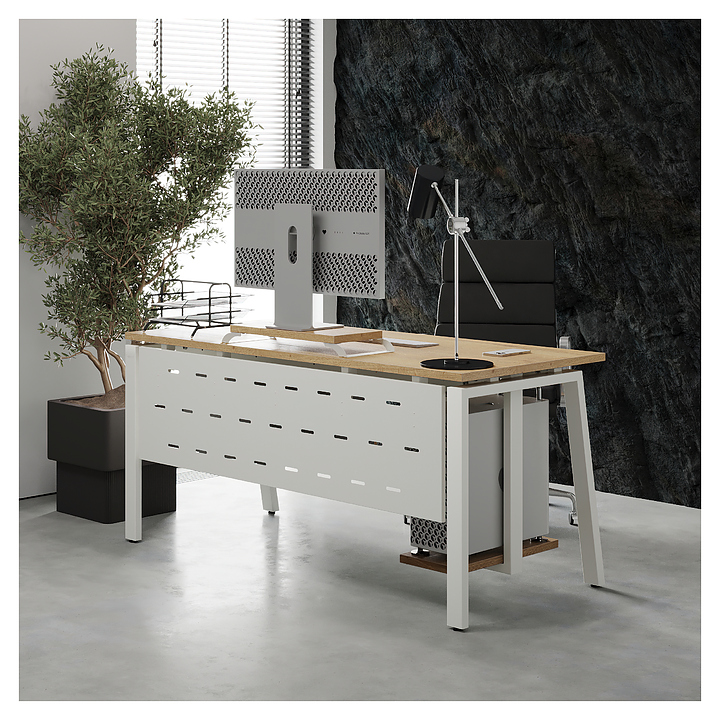 Офисный стол Кобор AB-180/80 white/natural используется в офисных помещениях и кабинетах руководителей. Модель оснащена A-образными опорами со скошенными фронтальными сегментами. Каркас выполнен из металла, выкрашенного в цвет белый муар (RAL9016), столешница – из ламинированной древесно-стружечной плиты (ЛДСП) цвета натуральный дуб (H1180 ST37). Опции (заказываются отдельно):